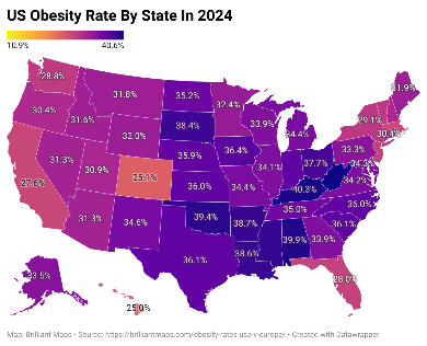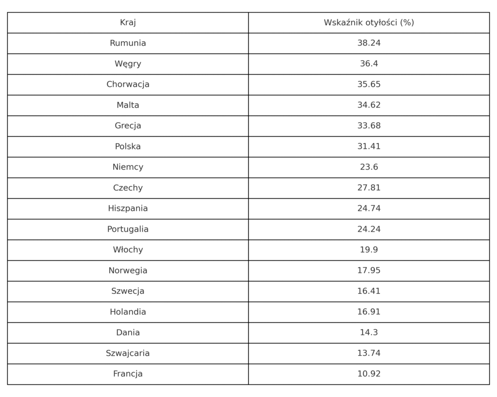 Według danych z 2024 roku, wskaźnik otyłości w Polsce wynosi 31,41%, co plasuje nasz kraj w górnej części europejskiej tabeli. Dla porównania, średnia dla Stanów Zjednoczonych to 32,62%, a najwyższy wskaźnik w USA odnotowano w Wirginii Zachodniej – 40,60% .